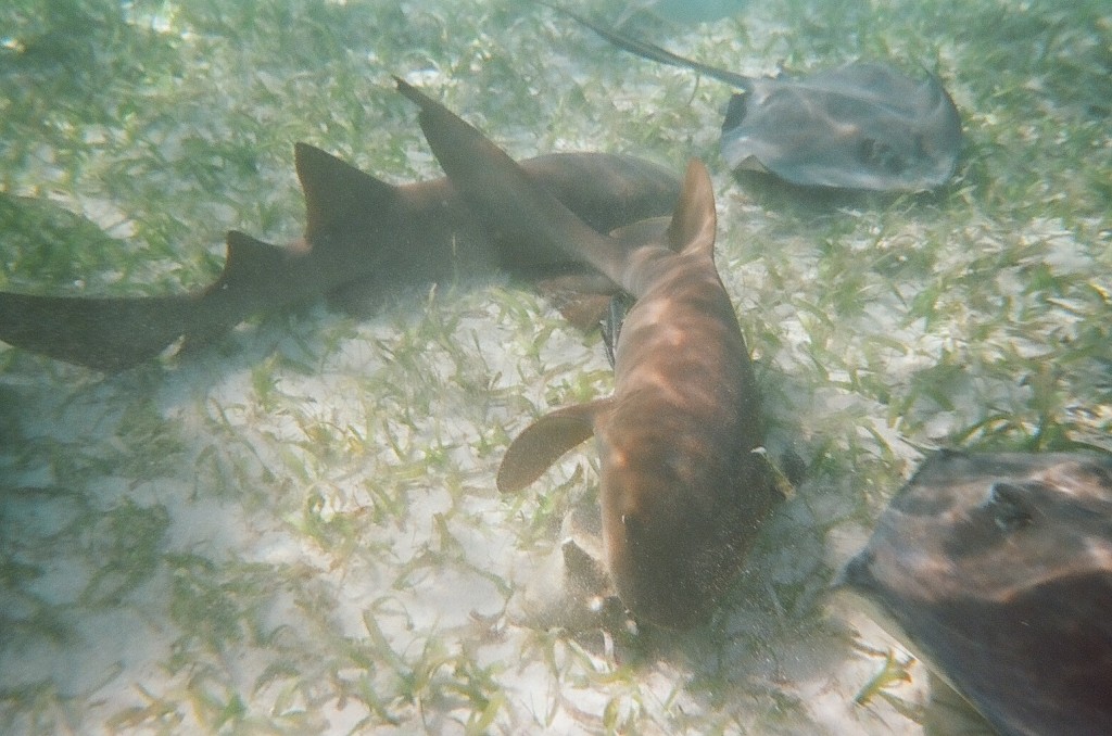 On one of our stops near Caye Caulker at a local version of the more famous Shark Ray Alley by Hol Chan, there were so many sharks and rays that we could hardly step out of the boat without landing right on top of one. Once in the water, they proved to be every bit as friendly and unafraid, swimming within a few inches of us from all directions.